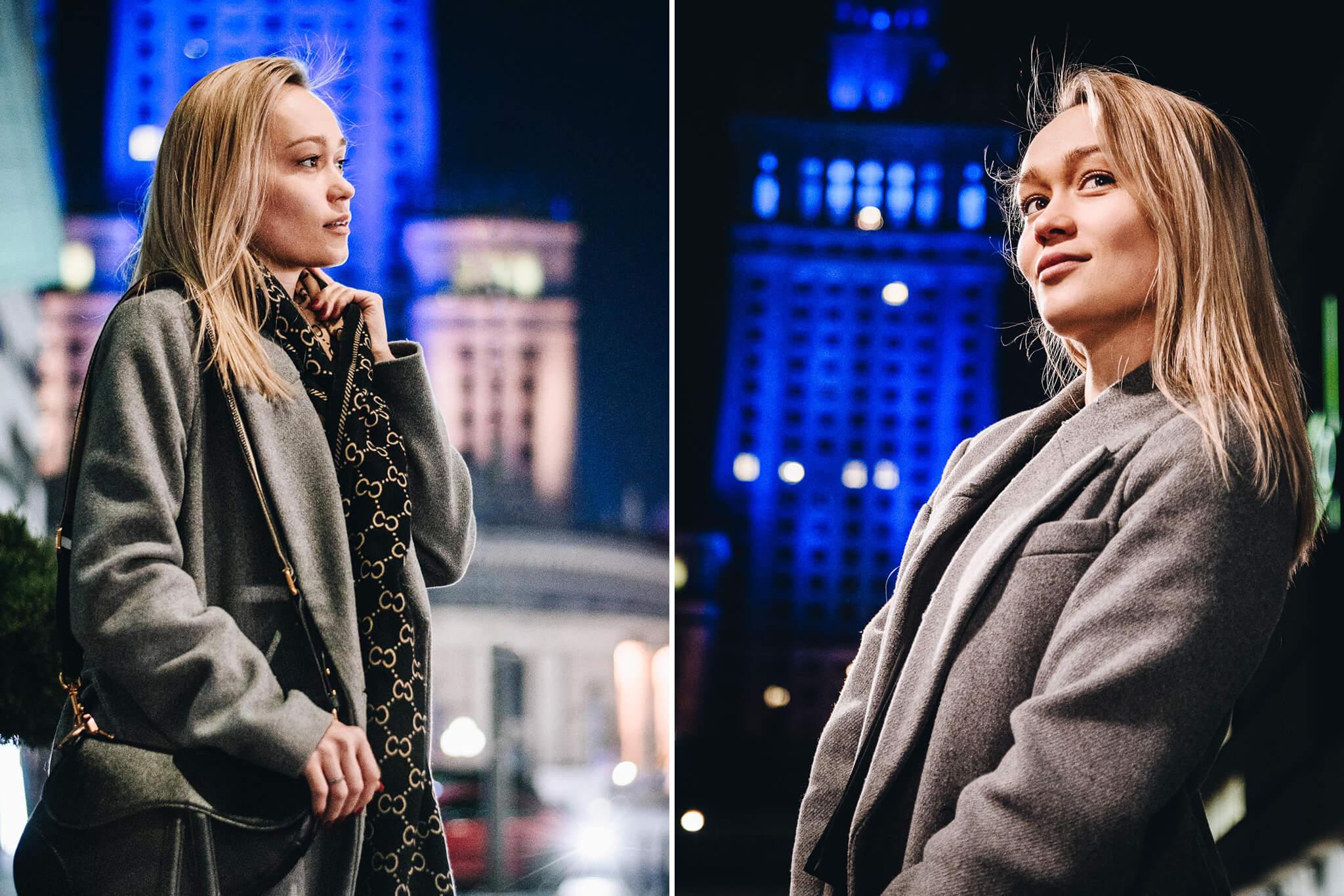 To już moja trzecia sesja z Katią. Tym razem zdecydowaliśmy się postawić na elegancki styl – długi płaszcz, szalik i czerwone szpilki zdecydowanie świetnie się ze sobą komponowały. Na zdjęcia wybraliśmy się wieczorem, gdyż chcieliśmy, żeby za tło posłużył nam pięknie oświetlony Pałac Kultury i Nauki. Dużą rolę odegrały także latarnie miejskie, które świeciły jasnym, białym światłem, co pozwoliło w bardzo ciekawy sposób oświetlić modelkę.