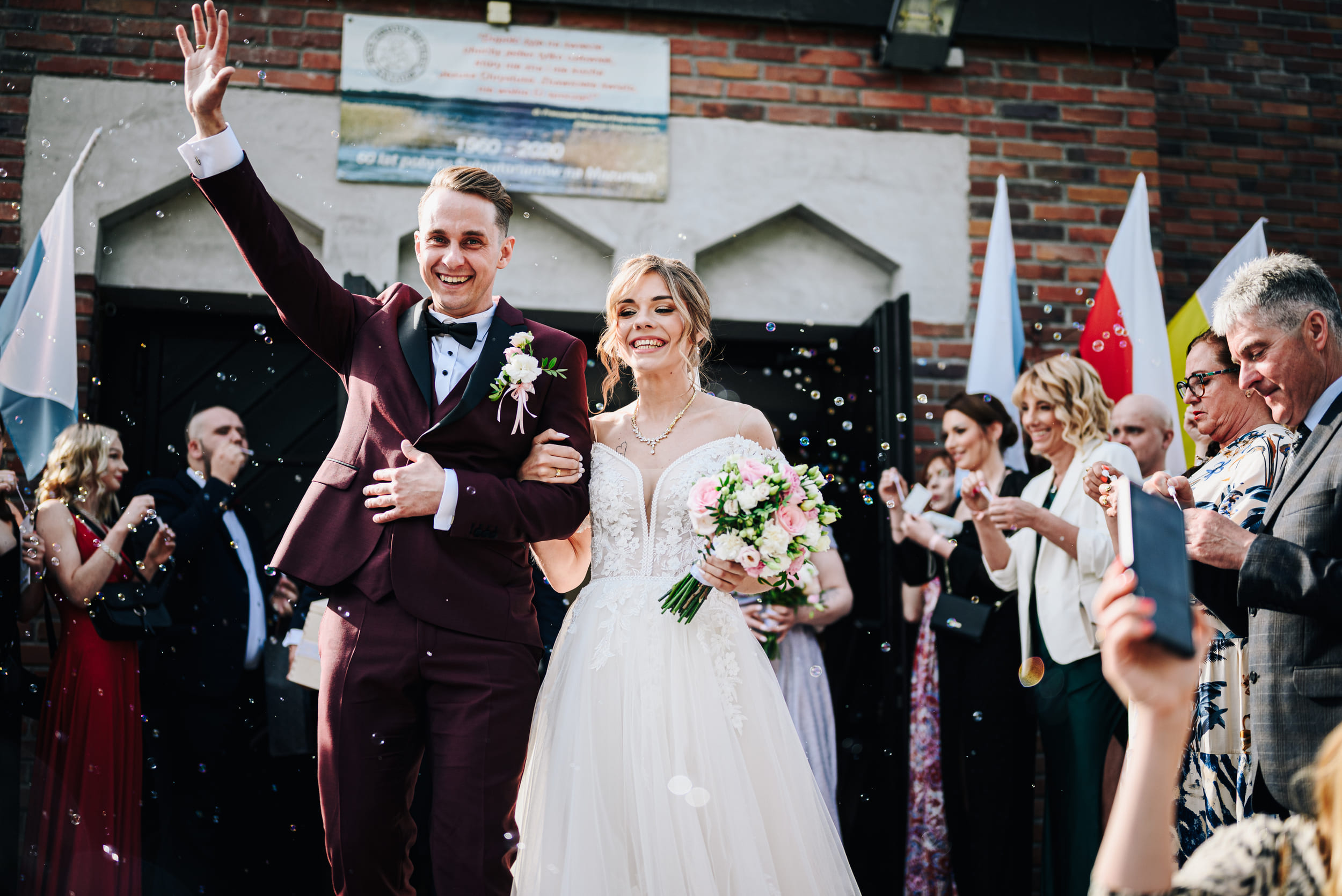 Wybuch radości – świeżo upieczeni małżonkowie opuszczają miejsce ceremonii, a na ich drodze stają zaproszeni goście z płatkami róż, konfetti, ryżem czy bańkami mydlanymi. To chwila, gdy na wszystkich twarzach pojawia się uśmiech i wielka radość.