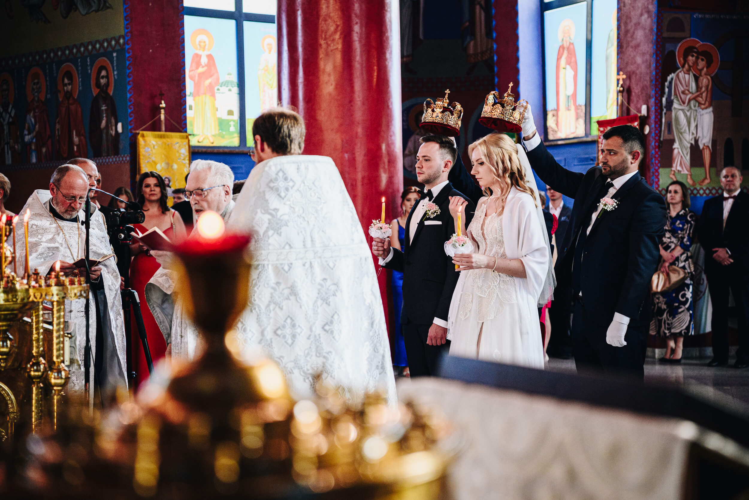 Ślub odbył się w przepięknej, prawosławnej świątyni – miejscu, które od progu zachwycało bogactwem kolorów, złoceniami, ikonami i niesamowitym światłem. Każdy detal wnętrza przyciągał wzrok i prosił o to, aby go uwiecznić. Dla fotografa jest to świetna okazja, żeby zrobić naprawdę fajne zdjęcia, ale też jest to duża odpowiedzialność, by oddać atmosferę miejsca i podniosłość chwili.